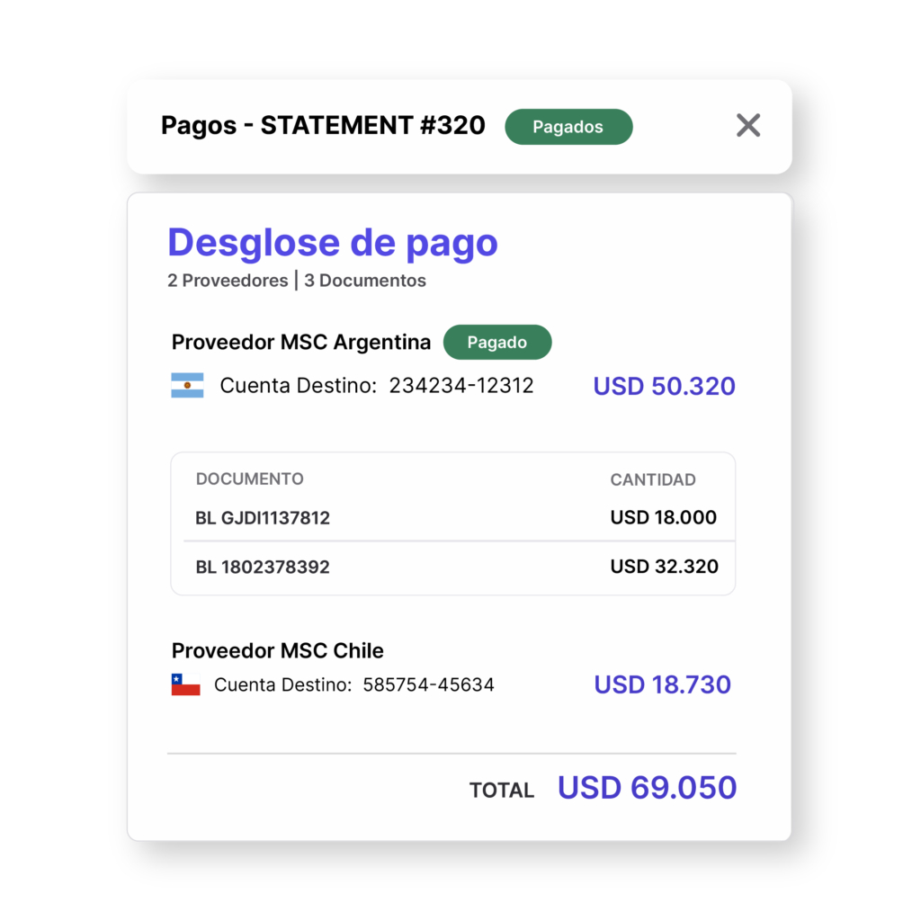 Generación de statements y pagos masivos a uno o varios proveedores en un par de clics.
