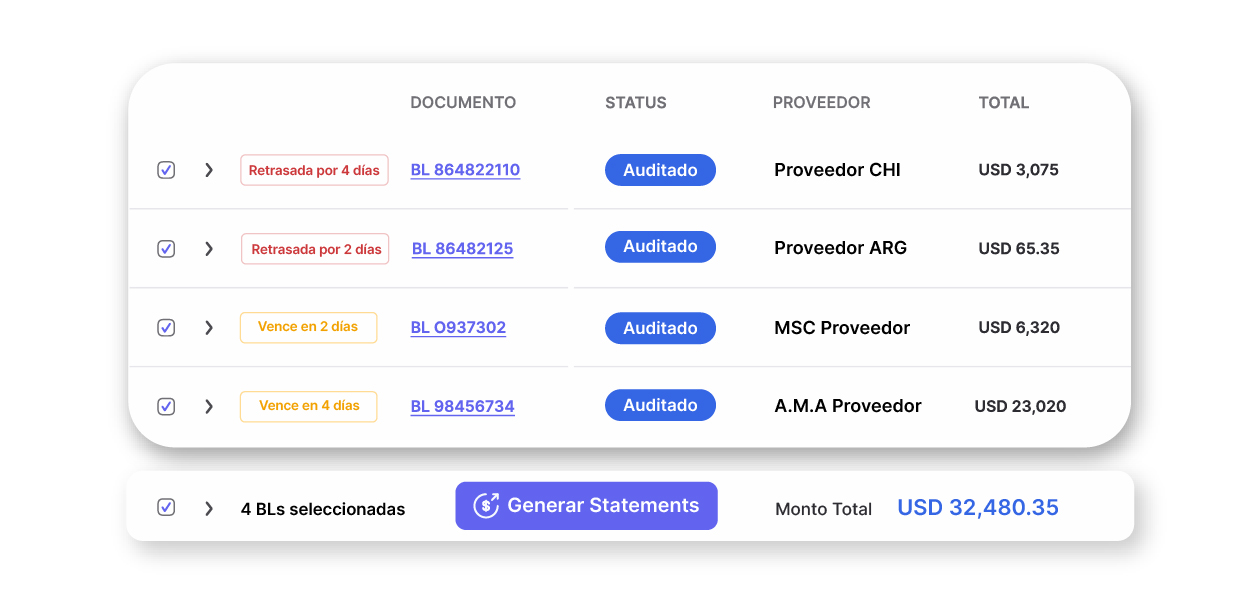 Selecciona las facturas aprobadas ,ordenadas por vencimiento, y genera statements de pagos con múltiples proveedores en un click.